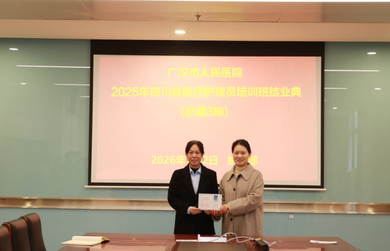 2026年2月2日下午,广汉市人民医院2025年四川省医疗护理员培训班(总第三期)结业典礼在三号会议室举行,医院分管领导邓琳副院长、护理部主任包芙蓉出席典礼。